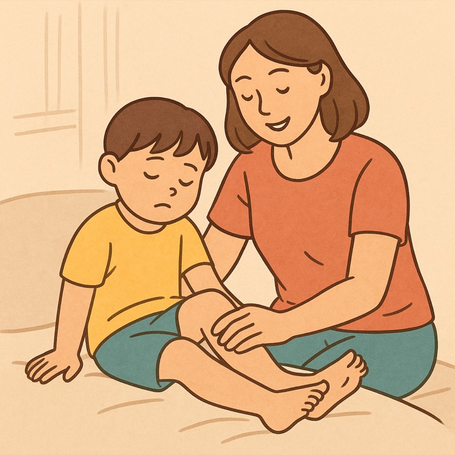 • 성장통: 다리 마사지, 따뜻한 찜질, 가벼운 스트레칭이 도움이 됩니다. 아이가 불안해하지 않도록 안심시켜 주세요.